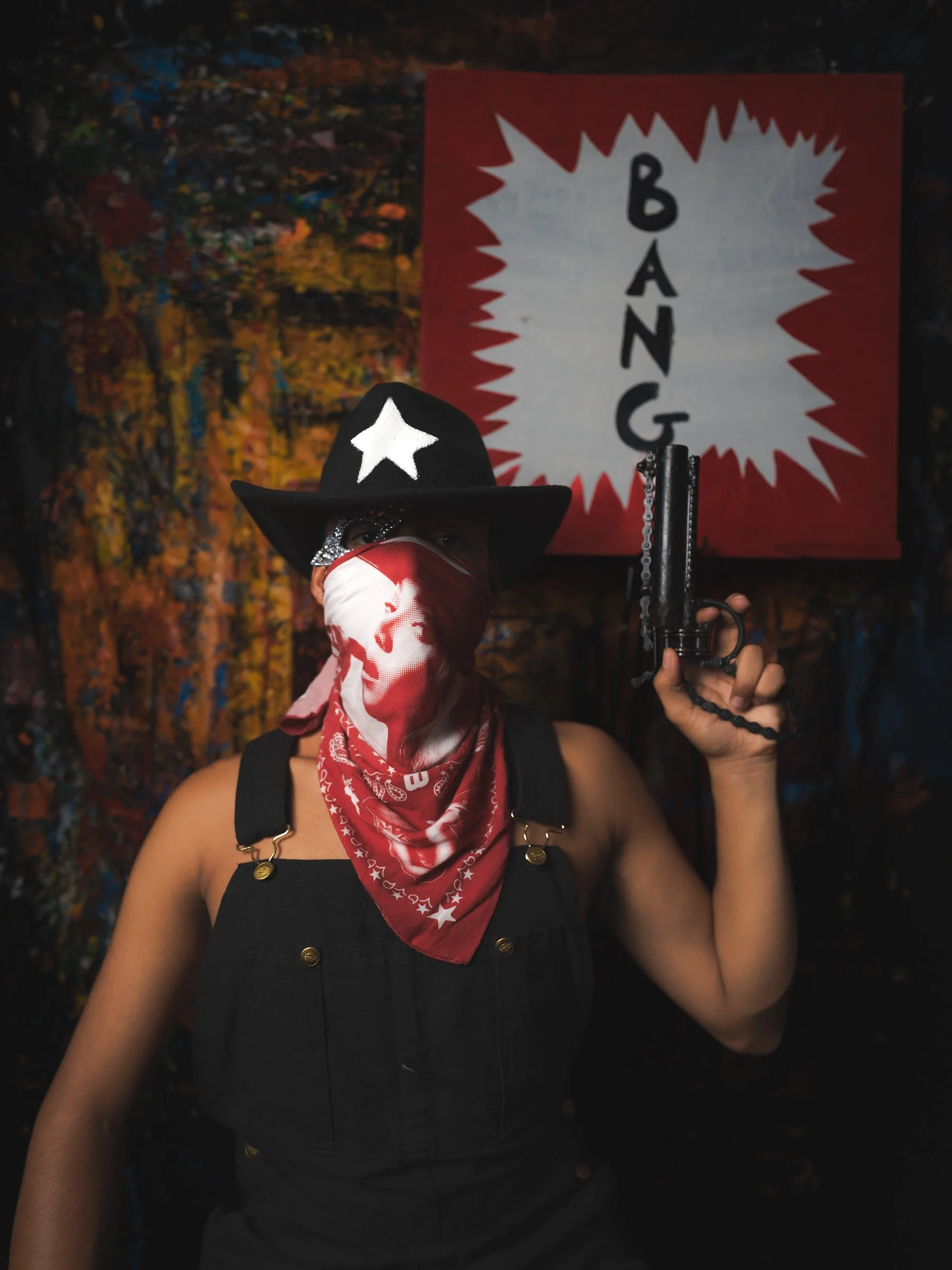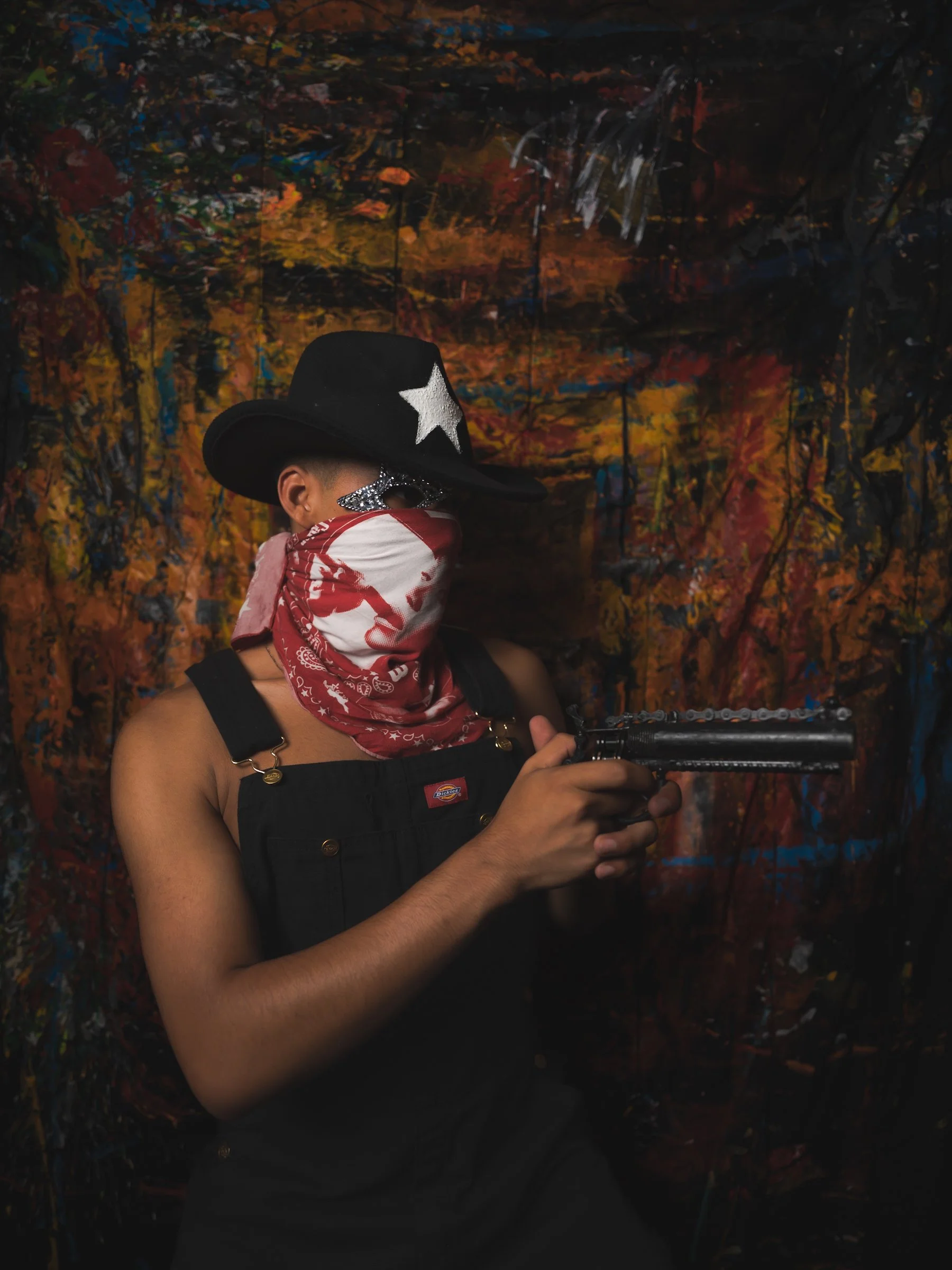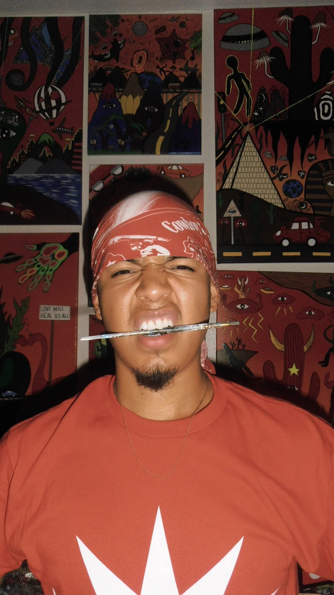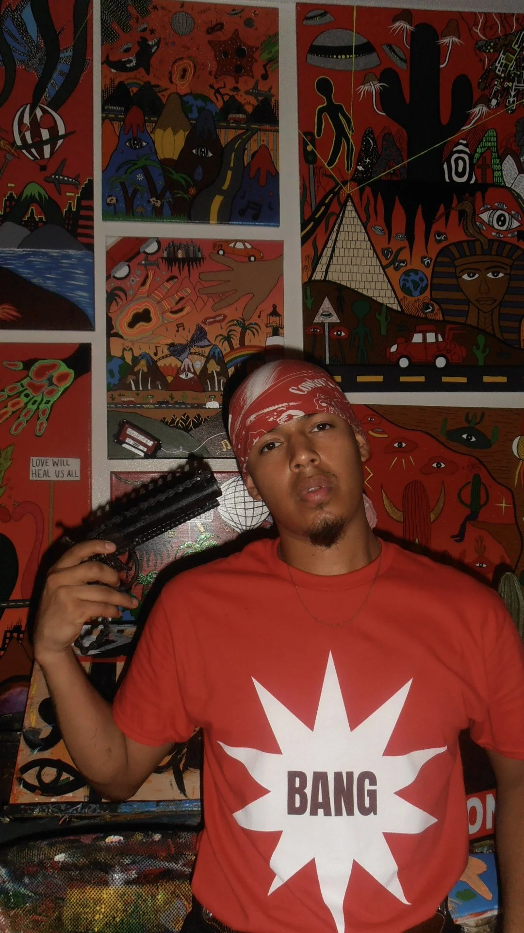 I hit ’em with art every time. Creating isn’t soft or quiet it’s powerful, direct, and meant to leave impact. My brush is the trigger, my colors are the bullets, and every piece I release hits straight to the heart. Art is how I fight, how I speak, how I live.”Me wearing this red bandana is more than just style—it’s my armor. It makes me feel powerful, like I’m stepping into another level of myself. The bold red over my head represents a BANG that same explosive energy I put into my art. It’s not just fabric, it’s my symbol of strength, street fashion, and the force of creativity I carry with me.
