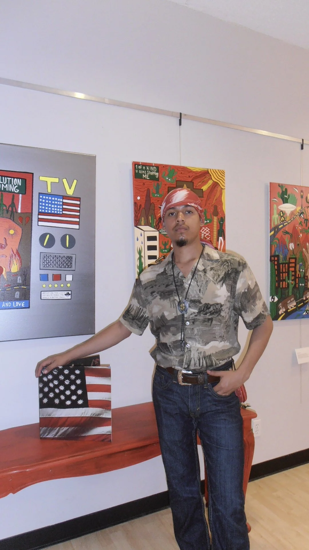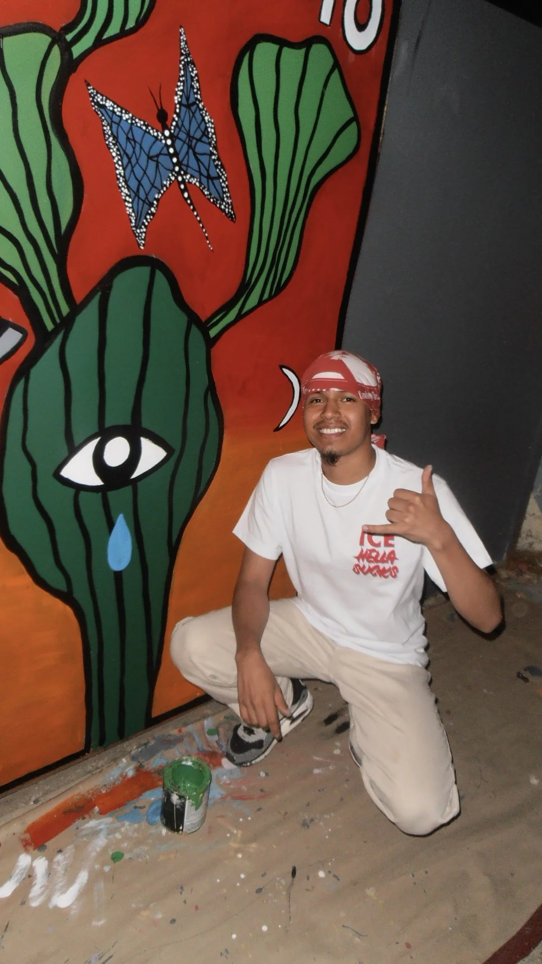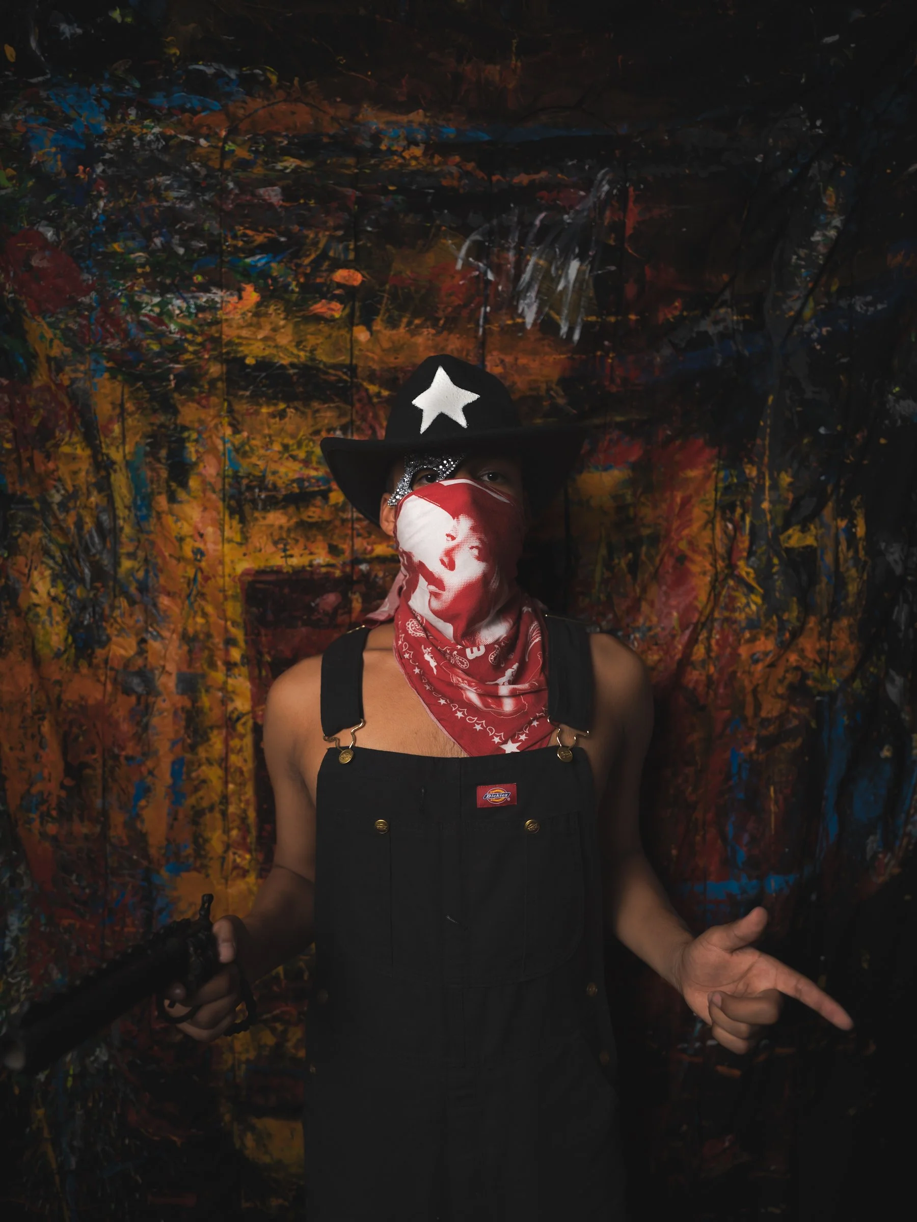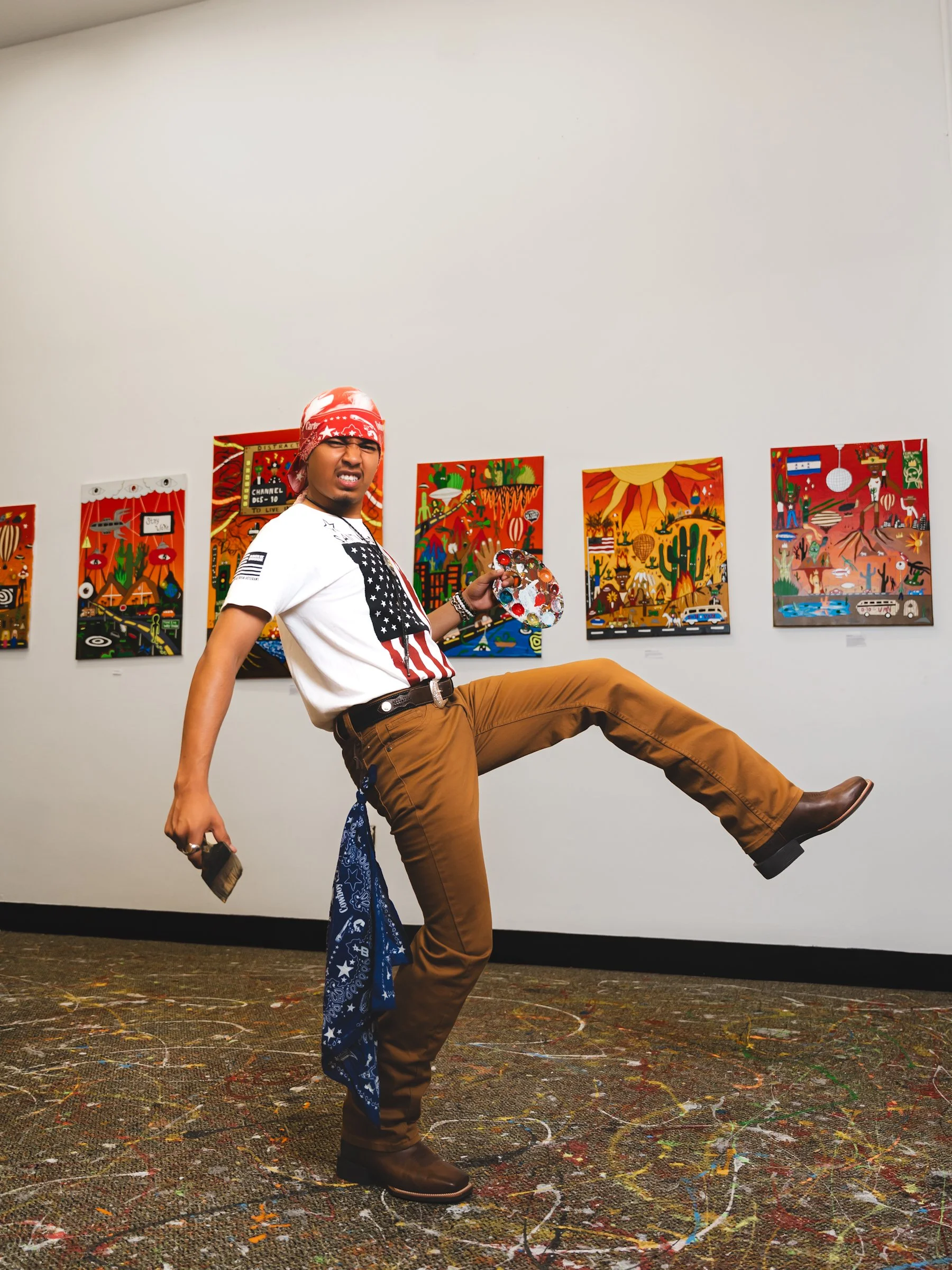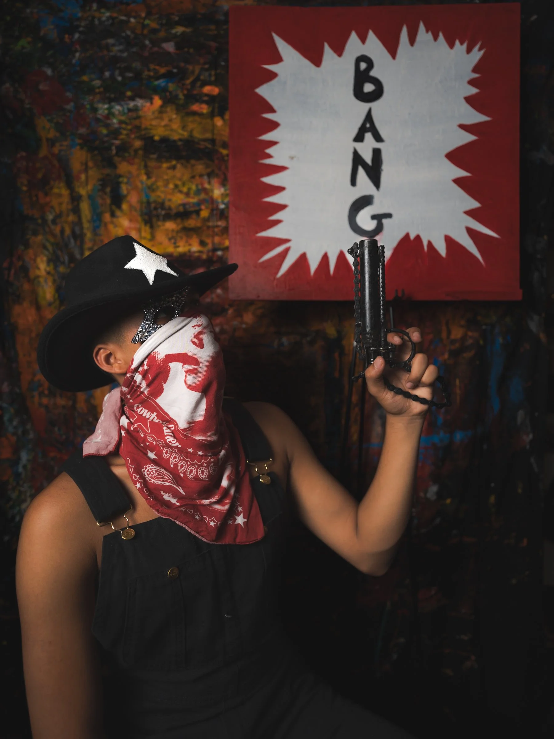 I hit ’em with art every time. Creating isn’t soft or quiet it’s powerful, direct, and meant to leave impact. My brush is the trigger, my colors are the bullets, and every piece I release hits straight to the heart. Art is how I fight, how I speak, how I live.”Me wearing this red bandana is more than just style—it’s my armor. It makes me feel powerful, like I’m stepping into another level of myself. The bold red over my head represents a BANG that same explosive energy I put into my art. It’s not just fabric, it’s my symbol of strength, street fashion, and the force of creativity I carry with me.